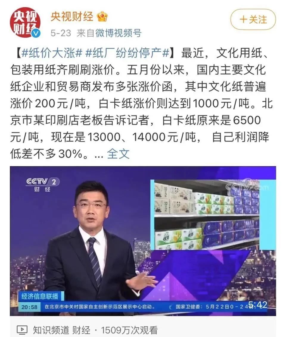 最近一段日子,大宗商品涨价屡屡上报。不过一件关于涨价的怪事,还是上了热搜:“纸张明明涨价 ,纸厂却纷纷停产”。各界不禁疑惑,涨价了扩大产能都来不及,怎么停产了呢?真实答案让人震惊,原来纸浆等造纸原材料 ,价格涨得比成品纸张还凶,“纸浆涨40%,成品只涨了20%”,成本和价格出现倒挂 ,纸厂生产越多赔的越多 。